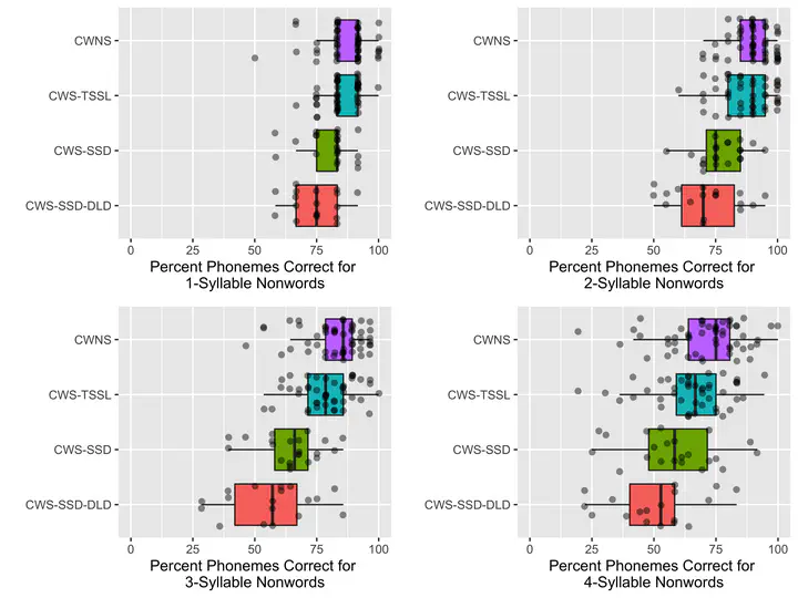 The aim of this study was to examine how nonword repetition (NWR) performance may be impacted by the presence of concomitant speech and lan- guage disorders in young children who stutter (CWS).One hundred forty-one children (88 CWS and 53 children who do not stutter [CWNS]) participated. CWS were divided into groups based on the presence of speech sound and/or language disorder or typical speech sound production and language abilities. NWR abilities were measured using stimuli composed of one- to four-syllable nonwords.CWS with typical speech and language and CWNS had higher accu- racy scores than CWS with concomitant speech and language disorders. We found no difference in accuracy scores between CWNS and CWS with typical speech and language abilities, nor did we find differences between CWS with speech sound disorder and CWS with both speech sound and language dis- orders. Accuracy decreased as nonword length increased for all groups.We found that the presence of a concomitant speech and lan- guage disorder was a driving factor behind poorer NWR performance in CWS. Accuracy scores differentiated CWS with concomitant disorders from CWS with typical speech and language but not CWS with typical speech and language from CWNS. Considering the speech and language abilities of CWS helped clar- ify poorer NWR performance and enhances generalizability to the population that exists clinically.