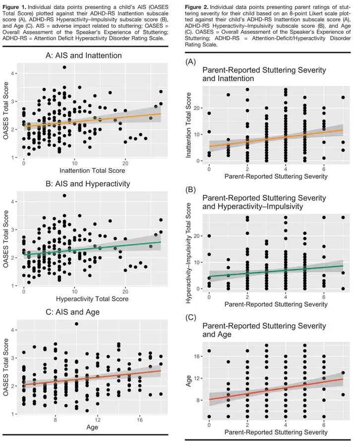 Research suggests that attention-deficit/hyperactivity disorder (ADHD) and its symptoms occur more frequently in individuals who stutter. The purpose of this study was to document the prevalence of ADHD diagnoses and ADHD symptoms in children who stutter and examine potential relationships between ADHD and stuttering characteristics. A total of 204 children between the ages of 5 and 18 years (M = 9.9 years; SD = 3.5 years) and their parents participated in the study. Parents completed the ADHD Rating Scale (ADHD-RS) indexing Inattention and Hyperactivity–Impulsivity symptoms, and children completed the age-appropriate version of the Overall Assessment of the Speaker’s Experience of Stuttering assessing the adverse impact of stuttering. Chi-square proportions and MannWhitney U tests were used to assess differences in demographic and other variables of interest between children with and without an ADHD diagnosis. Multiple linear regression was used to assess relationships between ADHD symptoms and stuttering characteristics. Parents reported that 17.2% of children who stutter in our sample had been diagnosed with ADHD. Over 40% of children without an ADHD diagnosis had ADHD-RS scores that met the criteria for further evaluation. No significant relationship between ADHD symptoms and stuttering severity was found, but child age and inattention scores significantly, albeit modestly, predicted the adverse impact of stuttering. Researchers and clinicians might be privy to a child’sADHD diagnosis, but they should recognize that many children who stutter without an ADHD diagnosis may exhibit elevated symptoms of inattention and hyperactivity–impulsivity. These symptoms can complicate both research outcomes and the treatment of stuttering.